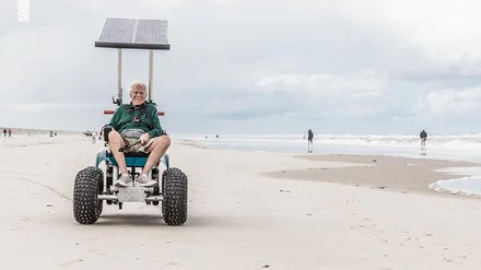 Barrierearm am Strand: Ein solarbetriebener Strandrollstuhl ermöglicht Gästen auf Juist mehr Mobilität am Meer. (Foto: © Lars Wehrmann)