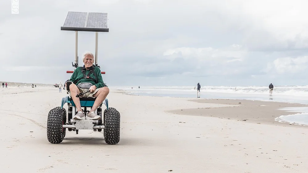 Mann fährt mit einem geländegängigen, solarbetriebenen Strandrollstuhl über den Strand auf Juist; im Hintergrund Nordsee und Spaziergänger.